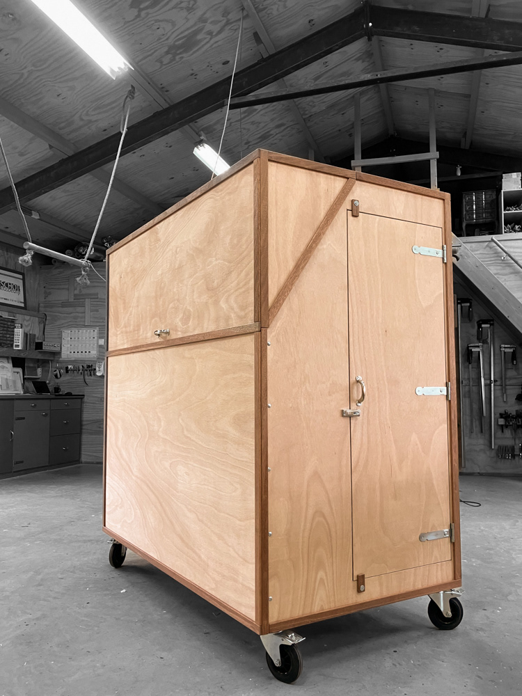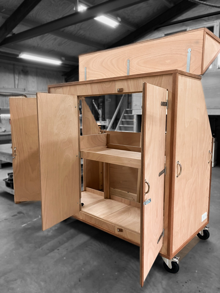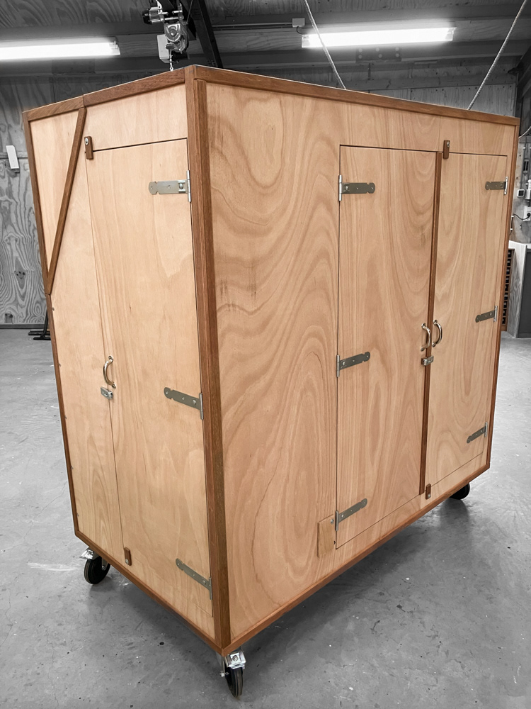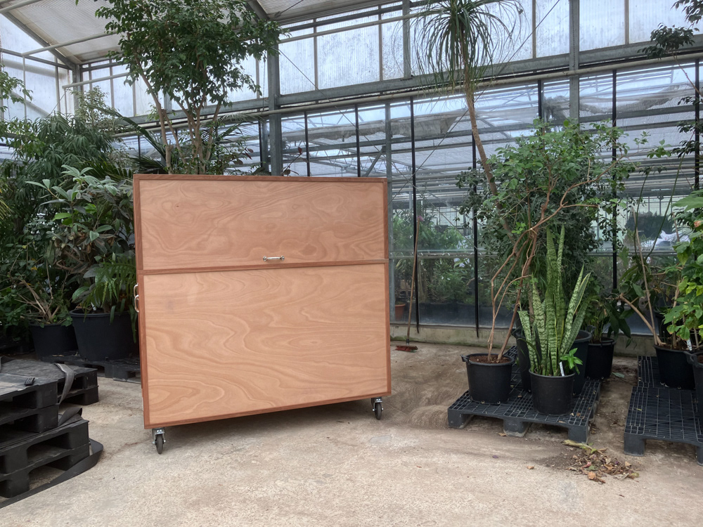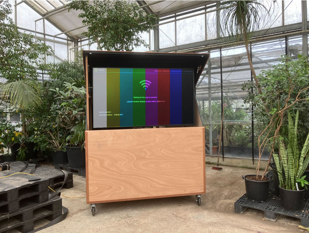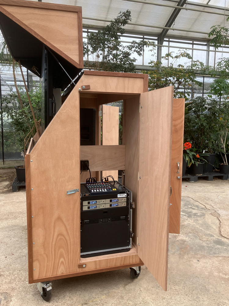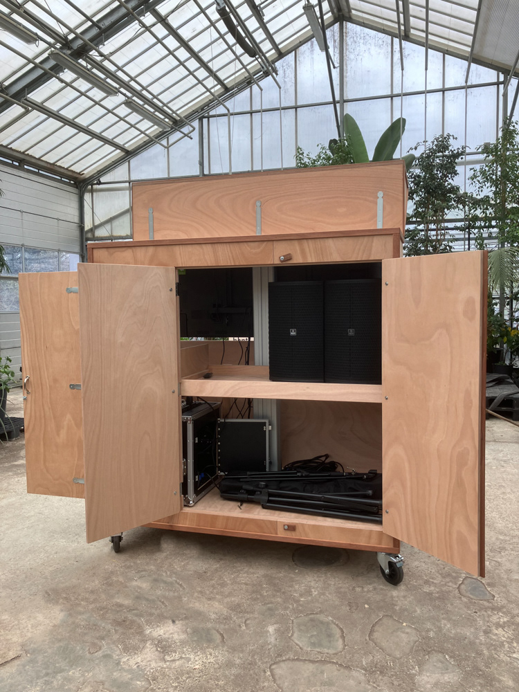 Media / presentatie kast. Afsluitbare kast voor monitor van 2 bij 1meter op een lift, audiomixer, opslag speakers, statieven kabels en dergelijke. Dampdicht ivm vocht in planten kas. Kas wordt gebruikt voor milieueducatie van de gemeente Haarlem.