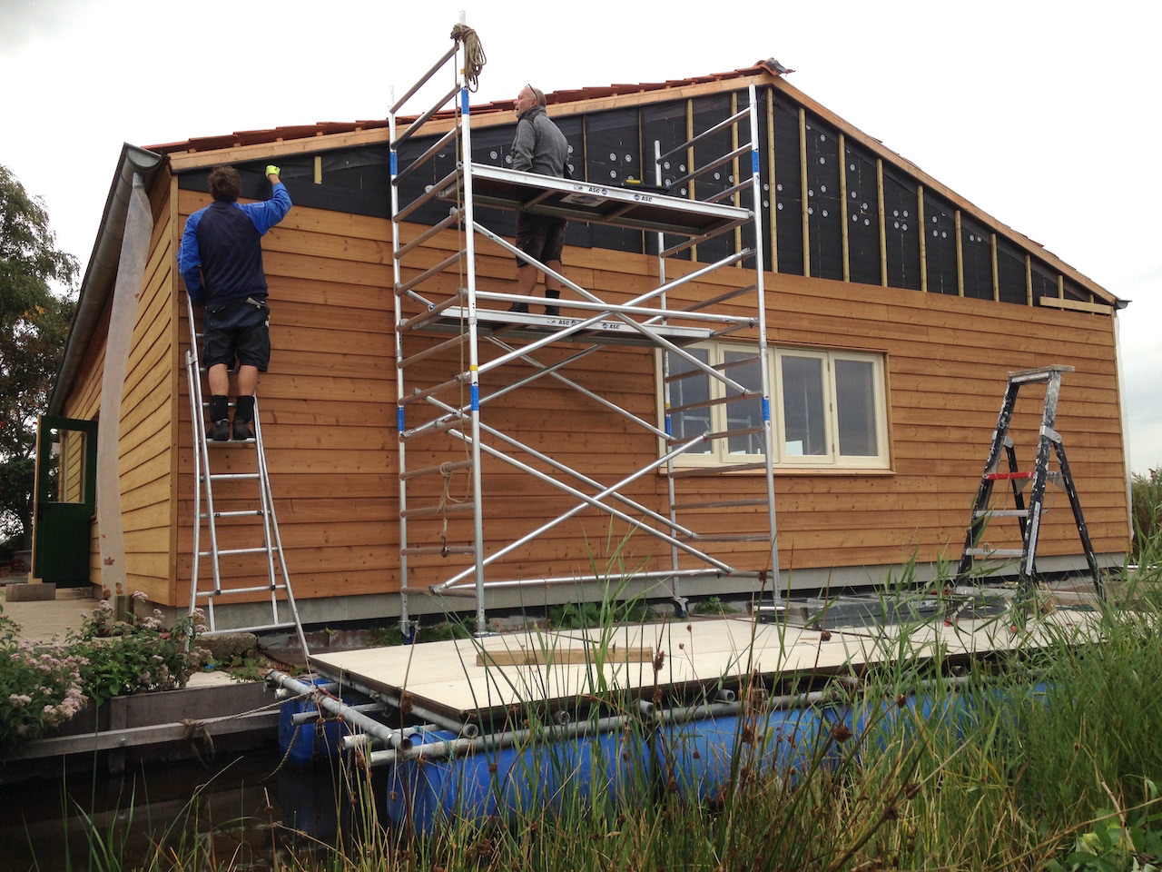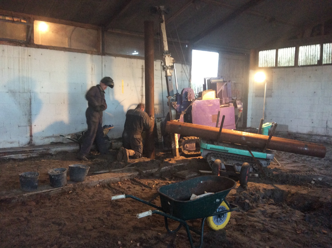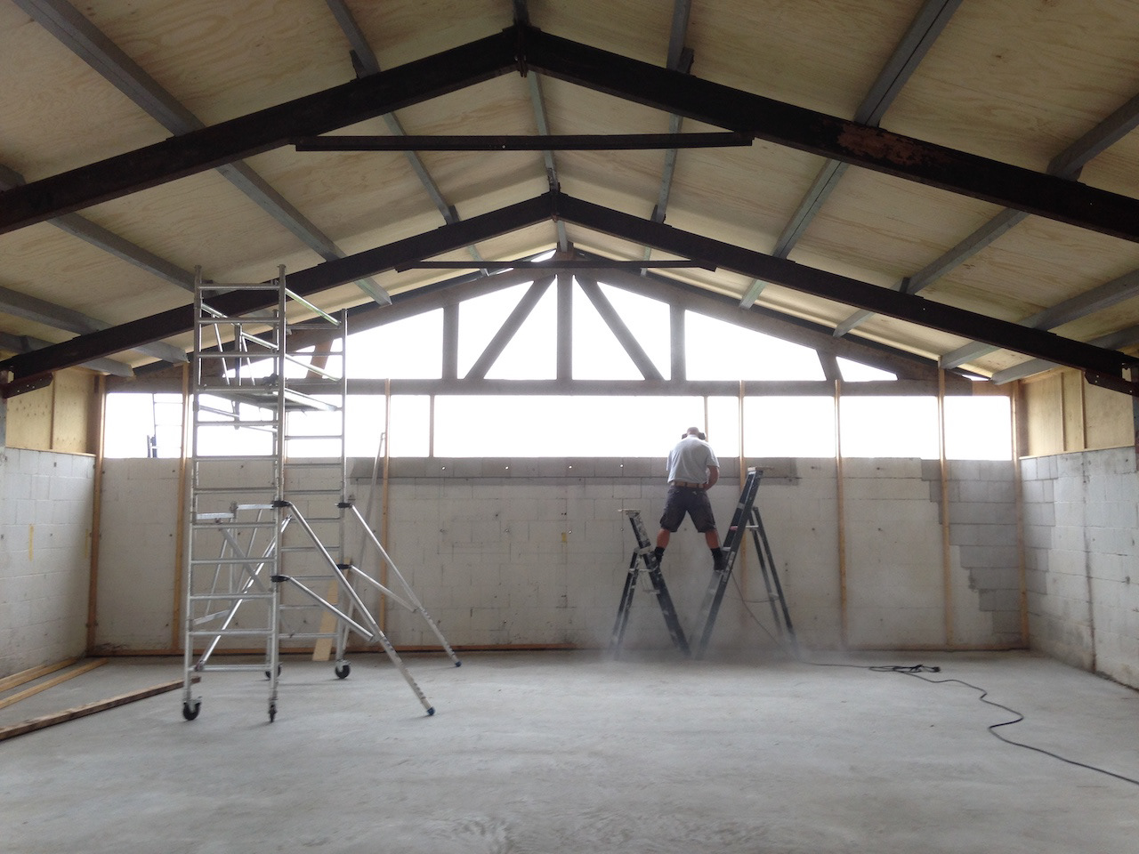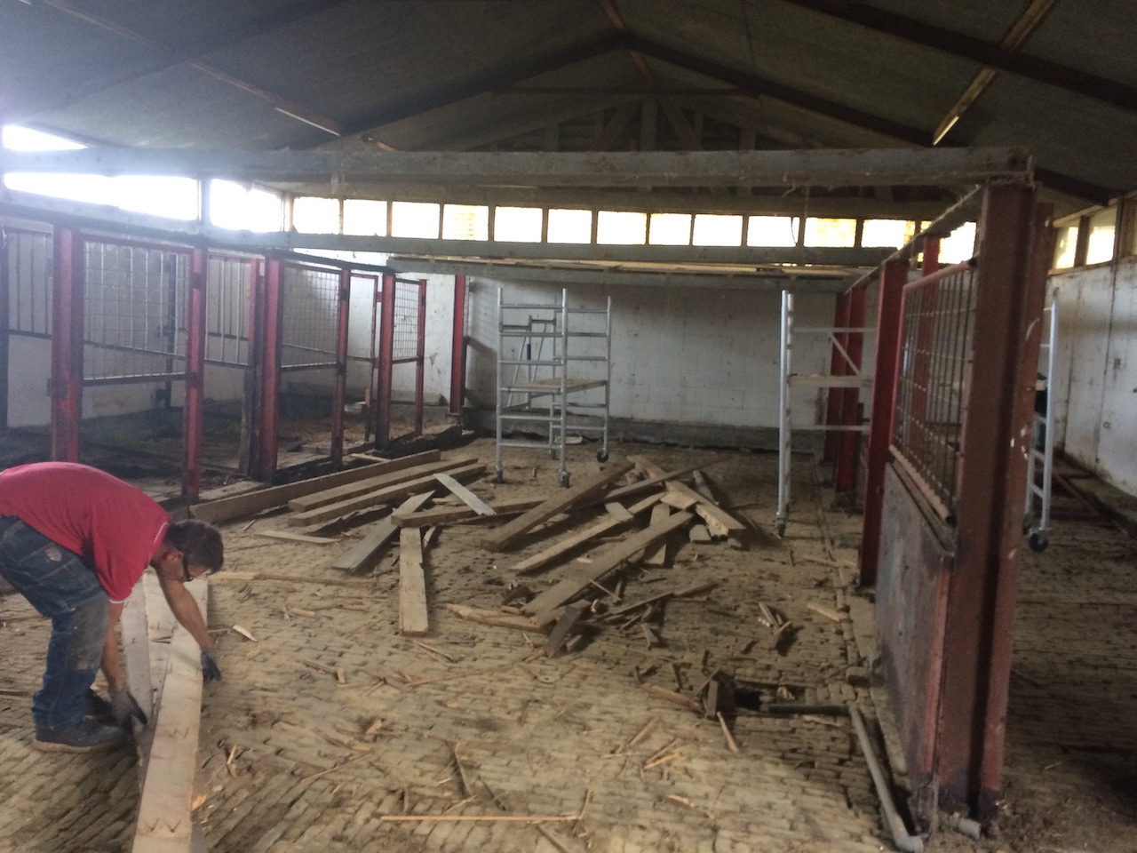 Oude stal wordt werkplaats. Voor nieuwbouw geen vergunning, wel voor renovatie. Dus nieuwe fundering, dak, vloerverwarming, kozijnen etc etc. De tweede stal rechts wordt gesloopt.