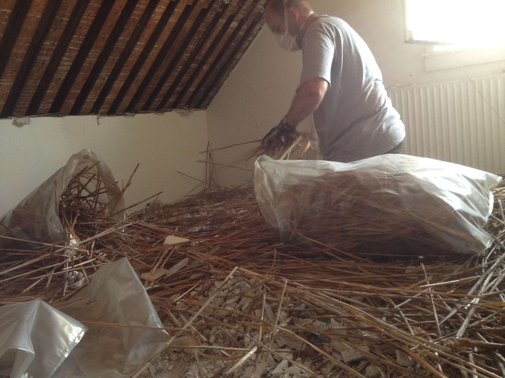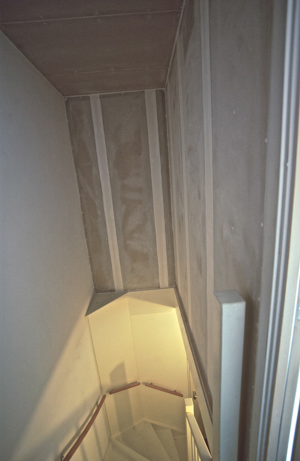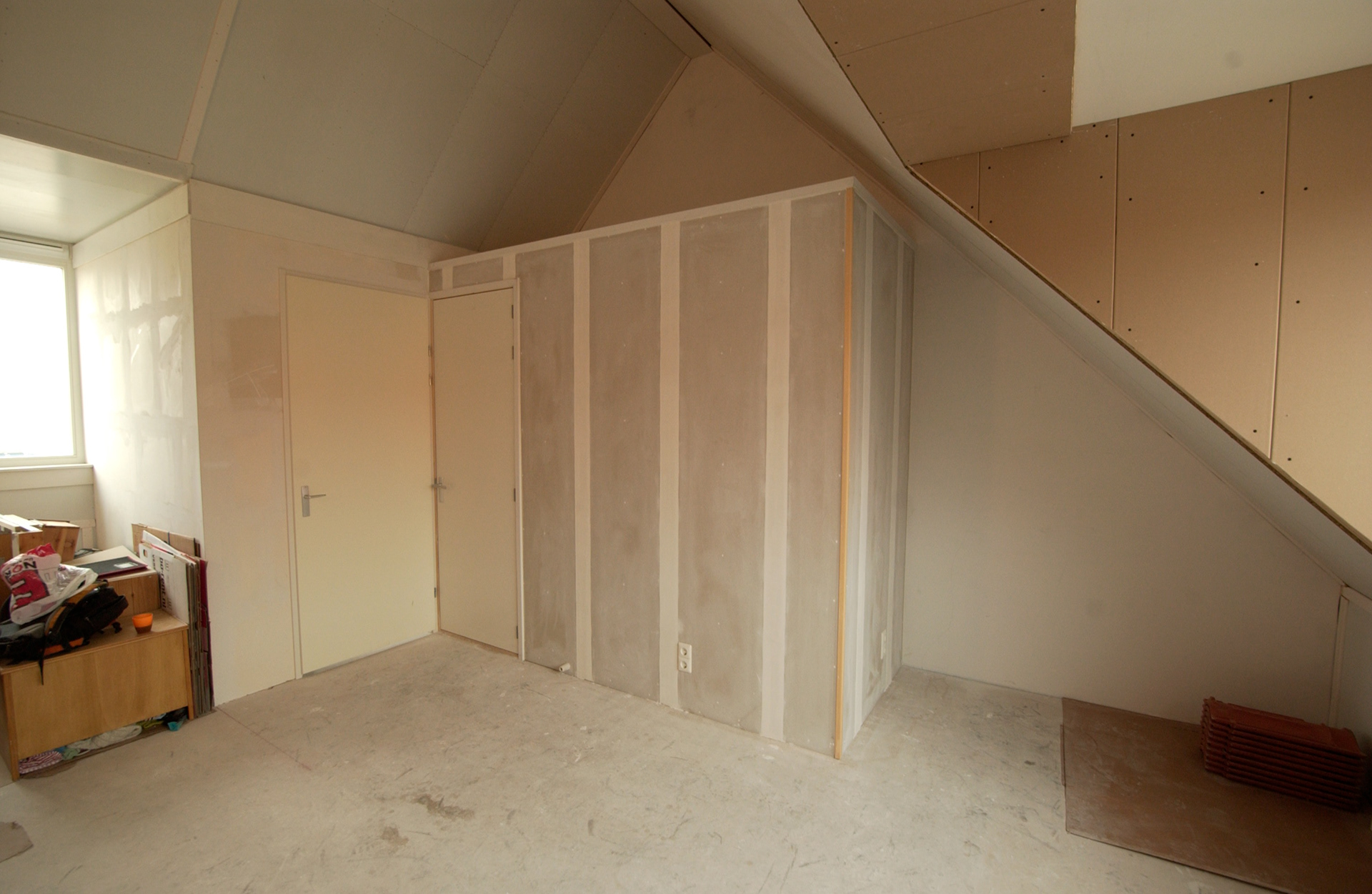 Open zolder dicht maken. Nieuwbouwwoning in Amsterdam Noord. Cellist moet veel kunnen repeteren. Glaswol, veel massa en luchtdichte deur voor zoveel mogelijk geluidsisolatie. Opdrachtgever ging het zelf schilderen.